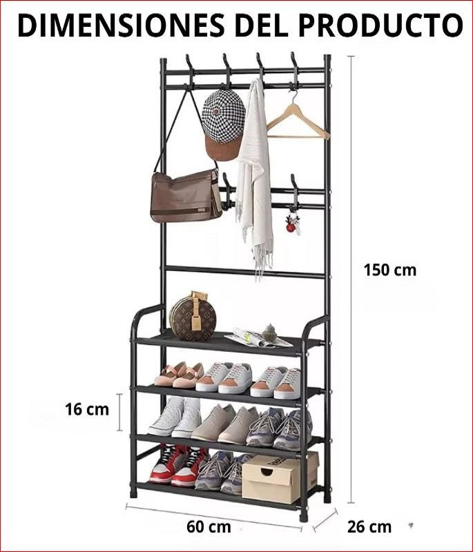 ¿Cansado del desorden en tu habitación? Este elegante rack es la solución perfecta. Con espacio para colgar ropa en la parte superior, almacenar zapatos en la parte inferior y una mesa en el medio para organizar bolsos y accesorios
